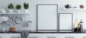 Makiety ramki plakat w aranżacji kuchni, panoramiczne tła, 3d render
