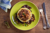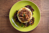Domowy burger lub patty z puree ziemniaczanym, na sałacie