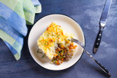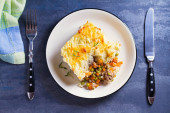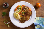 Domowy burger lub patty z puree ziemniaczanym na sałacie. Widok z wyżej, top studio strzał