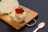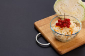 Płyta z kaszy gryczanej, smażone kotlety z mięsa, kawałki świeże ogórki i pomidory ozdobione oddział natką pietruszki. Widok z góry z miejsca kopii