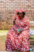 Kamanjab, Namibia-6 stycznia 2016: niezidentyfikowana kobieta Herero w Namibii. Były szacowane 250 000 ludzi Herero w Namibii w 2013