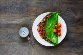 Zdrowy zielony wegańskie Sałatka w płytkę z kapusta, awokado, ogórek, orzeszkami piniowymi i miód sos na jasnym tle betonowych widok z góry. Czyste, jedzenie, odchudzanie, dieta, wegańskie jedzenie koncepcja. Płaskie świeckiego stylu.