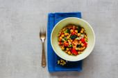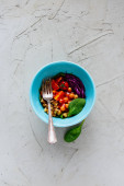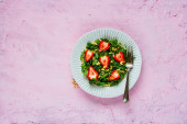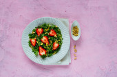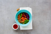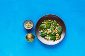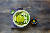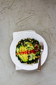 Zdjęcie "Zdrowy zielony wegańskie Sałatka w płytkę z kapusta, awokado, ogórek, orzeszkami piniowymi i miód sos na jasnym tle betonowych widok z góry. Czyste, jedzenie, odchudzanie, dieta, wegańskie jedzenie koncepcja. Płaskie świeckiego stylu." może być wykorzystywane do celów osobistych i komercyjnych zgodnie z warunkami zakupionej licencji Royalty-free. Obraz jest dostępny do pobrania w jakości wysokiej rozdzielczości do 5760x3840.