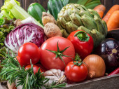 Świeże warzywa wielobarwne w drewnianej skrzyni. Podłoże drewniane.