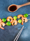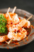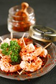 Zbliżenie marokański czerwony gorący chilles z królem krewetki na szaszłyki na niebieski płyta