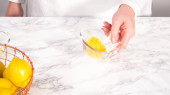 Krojenie na plastry cytryny organicznej na pokładzie cięcia drewna.
