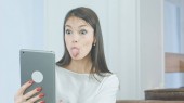 Atrakcyjna, młoda kobieta, sprawdzanie jej makijaż przy użyciu tabletu i przygotowanie do rozmowy wideo