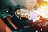 Pewność przystojny mężczyzna w garnitur jazdy samochodem
