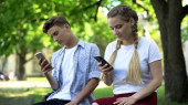 Chłopak i dziewczyna są skierowane do siebie. Lato w przyrodzie. W jego rękach posiada smartfona. Zapisuje numer telefonu. Emocja widuje się w parku. Pojęcie randki w przyrodzie.