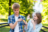 Zdjęcie "Młoda para studentów chłopiec i dziewczynka. Siedzą na ławce. W ręce trzyma kubki z kawą lub herbatą. One rozmawiać i patrzeć na prawo. W rzeczywistości naprzód. Szczelnie-do góry." może być wykorzystywane do celów osobistych i komercyjnych zgodnie z warunkami zakupionej licencji Royalty-free. Obraz jest dostępny do pobrania w jakości wysokiej rozdzielczości do 5760x3840.