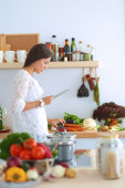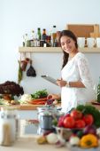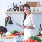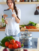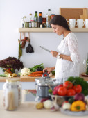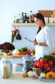 Młoda kobieta przy użyciu komputera typu tablet do gotowania w kuchni. Młoda kobieta