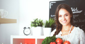 Uśmiechnięta młoda kobieta trzymająca warzywa w kuchni. Uśmiechnięta młoda kobieta