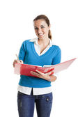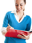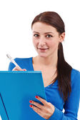 Młodych kobiet składującego lub supermarket pracownika pisania w Notatniku jako koncepcja sterowania dostaw towarów na białym tle