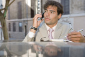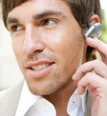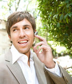 portret atrakcyjny młody biznesmen o rozmowy telefon komórkowy na zewnątrz w mieście.