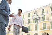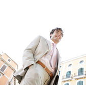 młody atrakcyjny biznesmen europejskie miasto z klasycznym biurowców w tle.