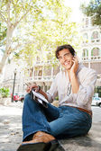 atrakcyjny biznesmen europejskie miasto z klasycznym biurowców w tle