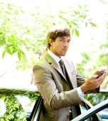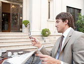 atrakcyjny młody biznesmen czytanie gazety siedząc w mieście przez biurowiec klasycznym.