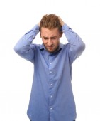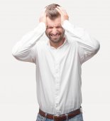 Portret człowieka biznesu, Wyświetlono ból głowy gest na białym tle na białym tle tło powierzchni reklamowych