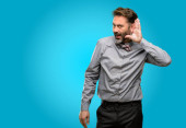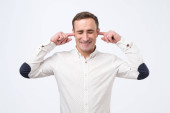 Portret człowieka biznesu, co nie słychać gest na białym tle