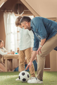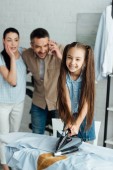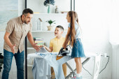 Ojciec pokazuje gest wzruszając ramionami do dzieci spalone koszula z żelaza w domu