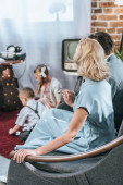 rodzice, oglądanie filmu i dzieci siedzi związany z liny na piętrze w domu