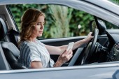 portret interesu w okularach za pomocą smartfona w samochodzie