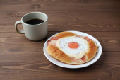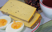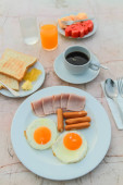 śniadanie, kiełbasy, sery, jajka, chleb z masłem i kubek herbaty na drewnianym stole