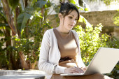 Zdjęcie "atrakcyjna kobieta za pomocą komputera PC laptopa siedząc w klasycznym parku." może być wykorzystywane do celów osobistych i komercyjnych zgodnie z warunkami zakupionej licencji Royalty-free. Obraz jest dostępny do pobrania w jakości wysokiej rozdzielczości do 5760x3840.