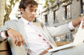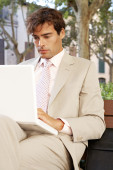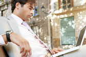 myślący biznesmen czytanie sekcji niejawnych gazetę siedząc na tarasie kawiarni