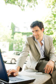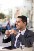 biznesmen z rękami skrzyżowanymi siedzi przy stoliku kawiarni na świeżym powietrzu, uśmiechając się.