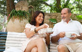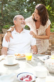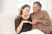 dojrzały człowiek proponuje małżeństwo z kobietą i oferuje jej pierścionek zaręczynowy.