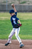 Młodzieży baseballista swinging kijem o intensywnej ekspresji na twarzy.