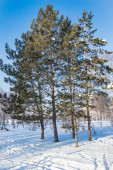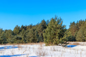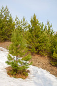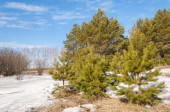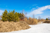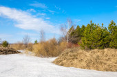 Wiosna w polu. Ostatni śnieg. Drzewo sosny. wiosenny, springtide, prime
