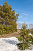 Wiosna w polu. Ostatni śnieg. Drzewo sosny. wiosenny, springtide, prime
