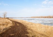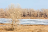 Rzeka wiosna, lodu na rzece. malownicze wiosnę krajobraz z rzeką lodu topi nagie drzewa i piękne chmury w błękitne niebo