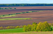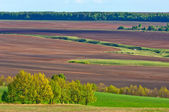 Pole zaorane, zasiane zboża. Zaorane pole w wiosenny dzień. Zaorane pole w czarnej ziemi. Zaorane pole w błękitne niebo