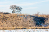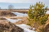 Wiosna w polu. Ostatni śnieg. Drzewo sosny. wiosenny, springtide, prime