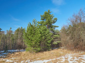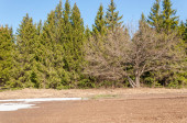 Wiosna w polu. Ostatni śnieg. Drzewo sosny. wiosenny, springtide, prime