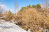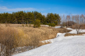 Wiosna w polu. Ostatni śnieg. Drzewo sosny. wiosenny, springtide, prime