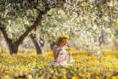 dziewczyna z kwiatami spacerując po polu zboża
