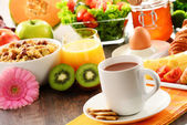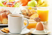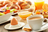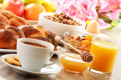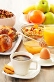 śniadanie obejmujące kawę, chleb, miód, sok pomarańczowy, musli