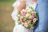 Zdjęcie "Bukiet ślubny, kwiaty w tym czerwony hypericum, róże, konwalie, mini róż, rozstawiony eukaliptusa, Astilbe, Driakiew, Pieris i bluszcz" może być wykorzystywane do celów osobistych i komercyjnych zgodnie z warunkami zakupionej licencji Royalty-free. Obraz jest dostępny do pobrania w jakości wysokiej rozdzielczości do 5760x3840.