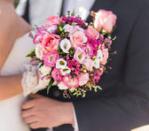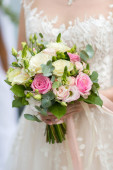 Bukiet ślubny, kwiaty w tym czerwony hypericum, róże, konwalie, mini róż, rozstawiony eukaliptusa, Astilbe, Driakiew, Pieris i bluszcz