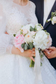 Zdjęcie "Bukiet ślubny, kwiaty w tym czerwony hypericum, róże, konwalie, mini róż, rozstawiony eukaliptusa, Astilbe, Driakiew, Pieris i bluszcz" może być wykorzystywane do celów osobistych i komercyjnych zgodnie z warunkami zakupionej licencji Royalty-free. Obraz jest dostępny do pobrania w jakości wysokiej rozdzielczości do 5760x3840.