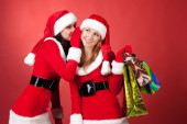 dwie kobiety w stroju Świętego Mikołaja, z torbą na zakupy