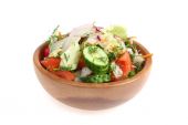 Metalowa miska sałatki warzywne, pomidor, ogórek, kapusta i zieleni na białym tle. Zdrowego odżywiania, diety, kuchnia wegetariańska i gotowanie.