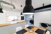 Zdjęcie "Otwarta kuchnia jasne białe meble. Island kitchen. Turkus lampy i zasłony. Nowoczesne, jasne poddasze Apartament." może być wykorzystywane do celów osobistych i komercyjnych zgodnie z warunkami zakupionej licencji Royalty-free. Obraz jest dostępny do pobrania w jakości wysokiej rozdzielczości do 5760x3840.
