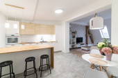 Otwarta kuchnia jasne białe meble. Island kitchen. Turkus lampy i zasłony. Nowoczesne, jasne poddasze Apartament.