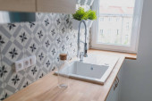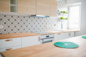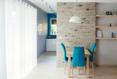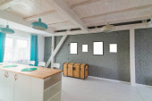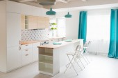 Zdjęcie "Otwarta kuchnia jasne białe meble. Island kitchen. Turkus lampy i zasłony. Nowoczesne, jasne poddasze Apartament." może być wykorzystywane do celów osobistych i komercyjnych zgodnie z warunkami zakupionej licencji Royalty-free. Obraz jest dostępny do pobrania w jakości wysokiej rozdzielczości do 5760x3840.