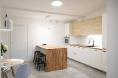 Nowoczesne białe szafki kuchenne z płytą indukcyjną. Otwarta kuchnia jasne białe meble. Island kitchen. Turkus lampy i zasłony. Nowoczesne, jasne poddasze Apartament.